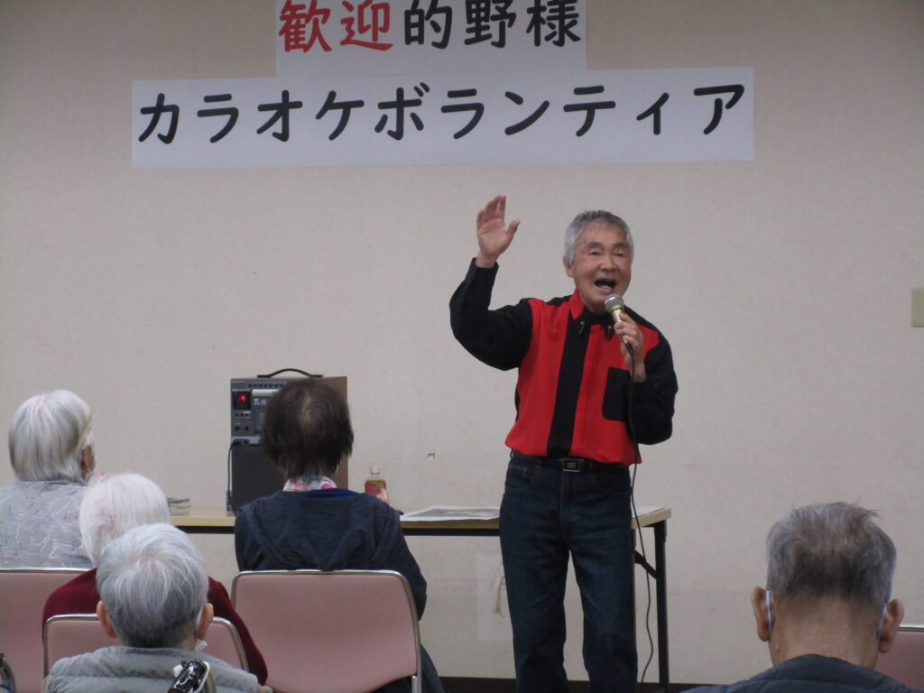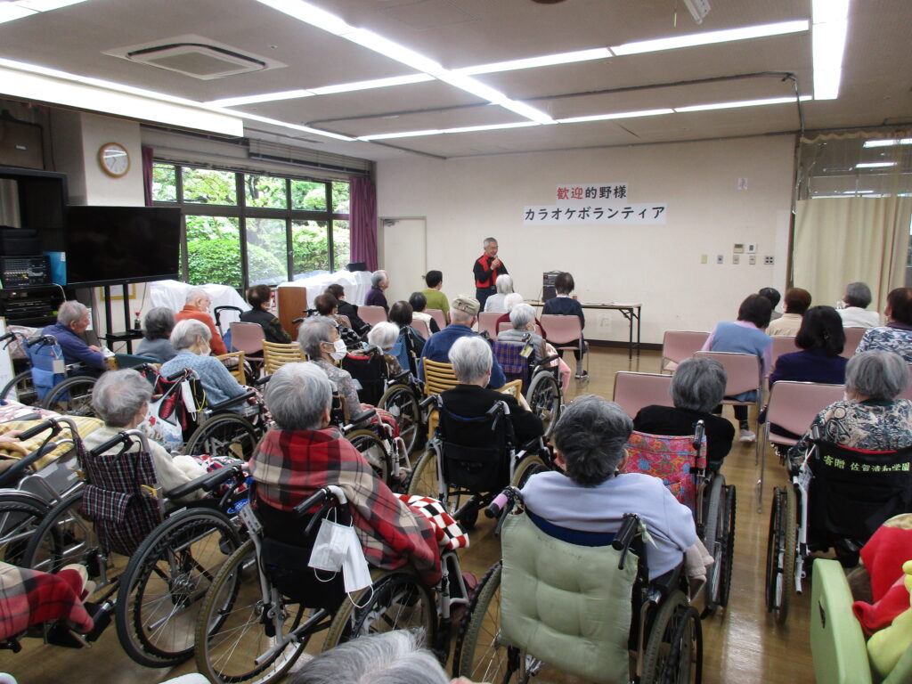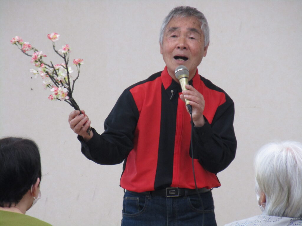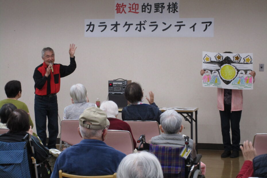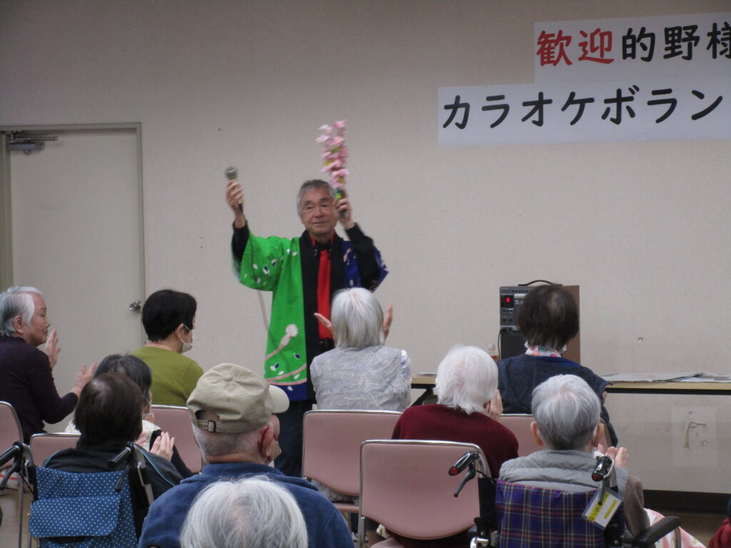 カラオケボランティアの的野勝様が来苑されました! by ryoyuukai2026年4月26日2026年4月26日 4月23日(木)カラオケボランティアの的野様が今年も桂寿苑に来苑されました!多数のご利用者様が参加され、大いに盛り上がりました♪ 的野様の美しくい歌声と、軽快なトークで会場は笑いと拍手に包まれました♪ 「みなさん。歌は笑って歌うのが一番ですよ!」との的野様の呼びかけもあり、ご利用者様も楽しそうに歌われていました♪