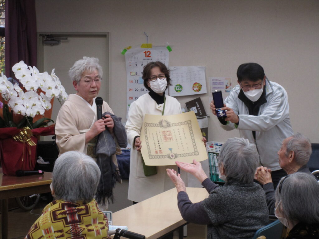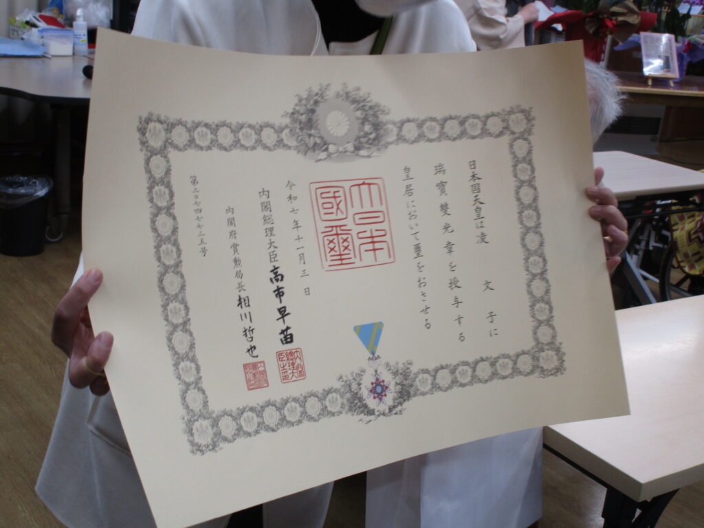桂寿苑の凌文子施設長が秋の叙勲「瑞宝双光章」を受賞されましたby ryoyuukai2025年12月11日2025年12月11日 令和7年11月3日に秋の叙勲が発表され、桂寿苑の凌文子施設長が「瑞宝双光章」を受賞されました。瑞宝双光章は、公務等に長年にわたり従事し、成績を挙げた方に授与されるものです。昭和55年(1980年)9月に社会福祉法人凌友会を設立し、翌年に特別養護老人ホーム「桂寿苑」の事業を開始して以降、凌俊朗前理事長と共に佐賀県の高齢者介護、社会福祉に貢献。83歳となった今も、介護老人福祉施設「桂寿苑」の施設長として高齢者の体調に目を配る姿が評価され、今回の受賞となりました。 受賞式の後「今日まで私が施設長を続けて来られたのもご利用者、ご家族、職員等いろいろな方の支えがあったおかげです」と挨拶をされ、みなさんと喜びを分かち合えたひとときとなりました。