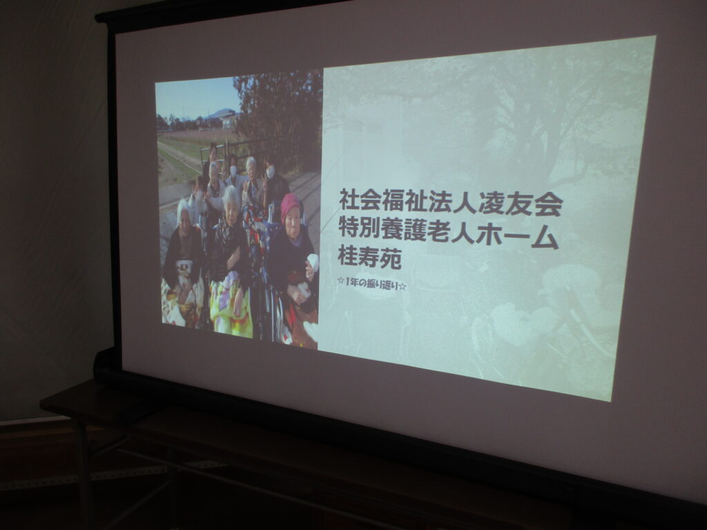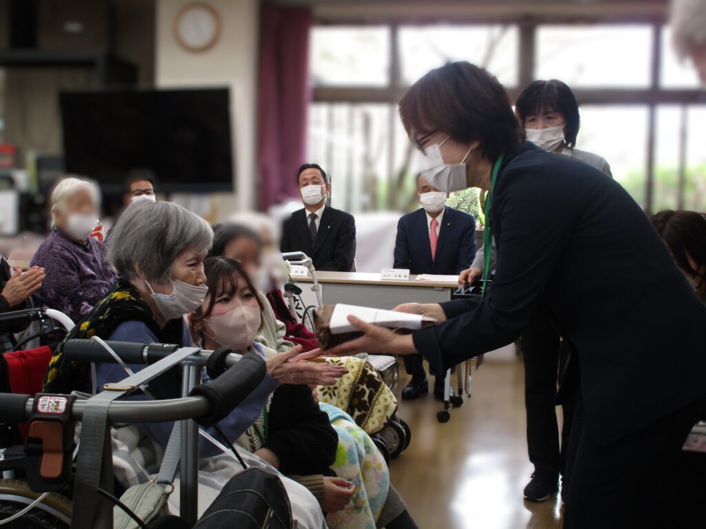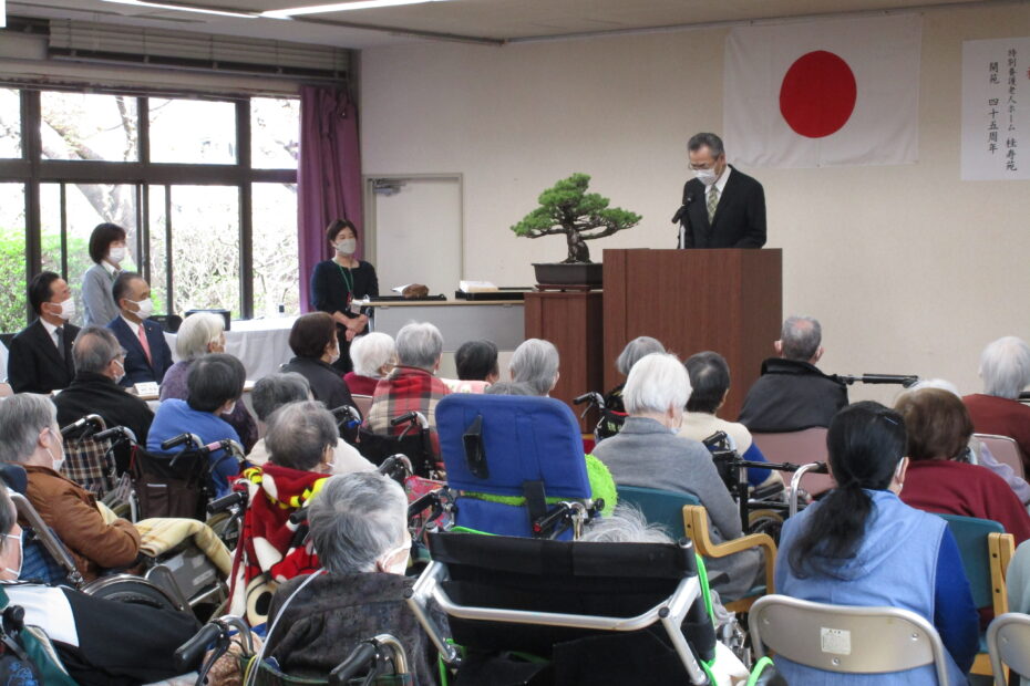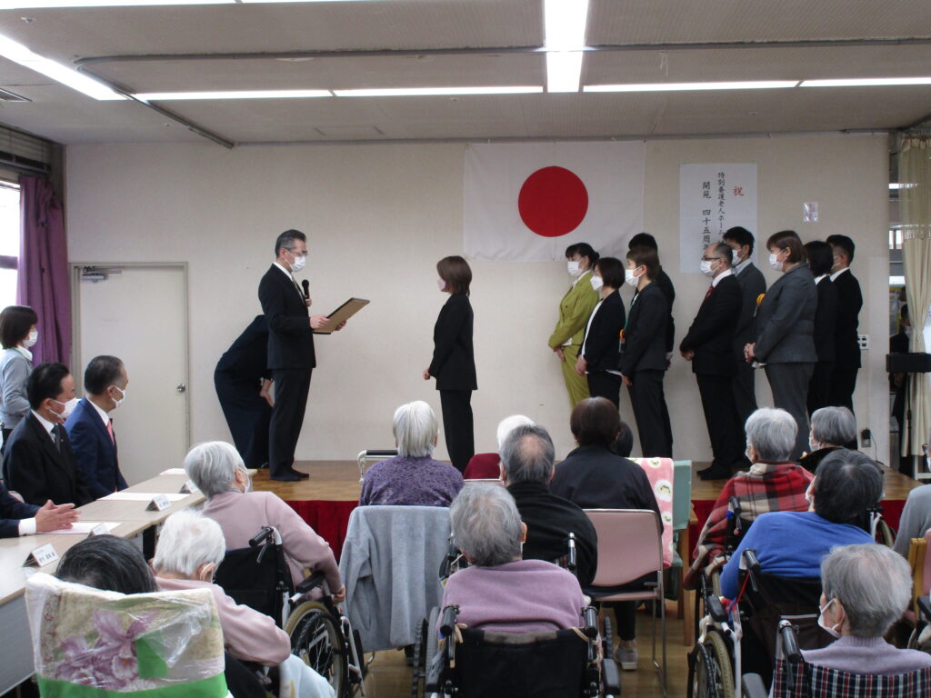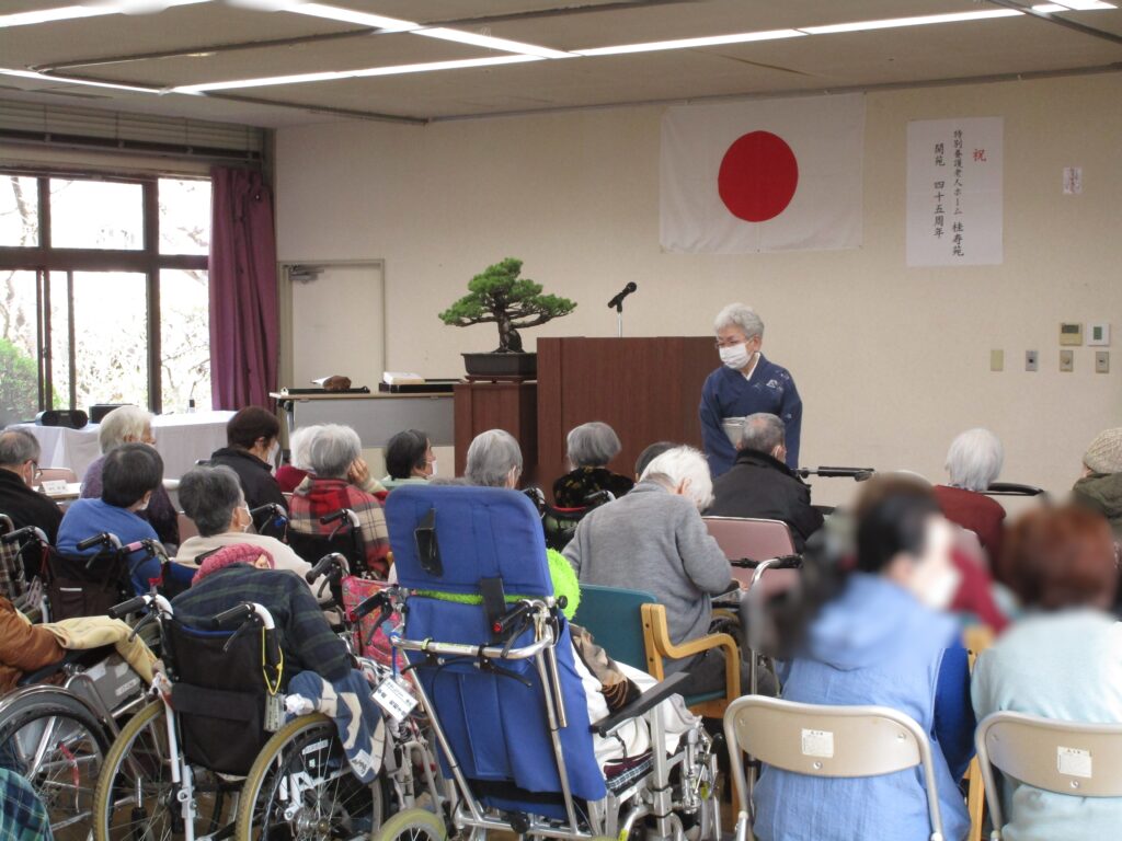 第45回開苑記念式典by ryoyuukai2026年4月5日2026年4月5日 桜の花も見ごろな4月5日の日曜日、桂寿苑の第45回目の開苑記念式典が行いました。今年も多数のご利用者様、ご家族様、来賓の皆様に出席して頂きました。 初めに桂寿苑のサービスに関するアンケート報告や今後の制度等についての説明、写真を通して令和7年度の思い出の振り返り、等の家族説明会を行いました. その後、開苑記念式典では、理事長の挨拶、入苑者様への記念品の贈答、職員表彰等を行いました。 昼食の時間には、うなぎ散らし寿司、フルーツジュレ等を皆様美味しそうに食べられていました♪ 午後からはご利用者様とご家族様がお茶等を飲みながらゆっくり過ごして頂く喫茶コーナーを設け、穏やかな時間が流れていました♪